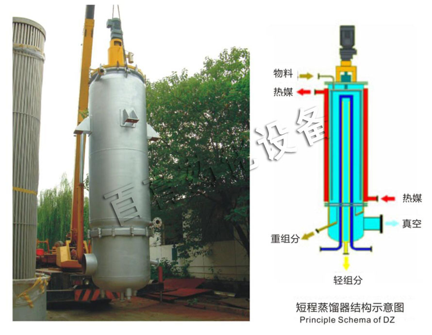被蒸發(fā)的分子經(jīng)過很短的距離到達(dá)內(nèi)置冷凝器并冷凝下來,通過蒸發(fā)器底部的出料口排出,重組份進(jìn)入短程分子蒸餾設(shè)備的殘?jiān)占鄄膫?cè)面的出口排出。